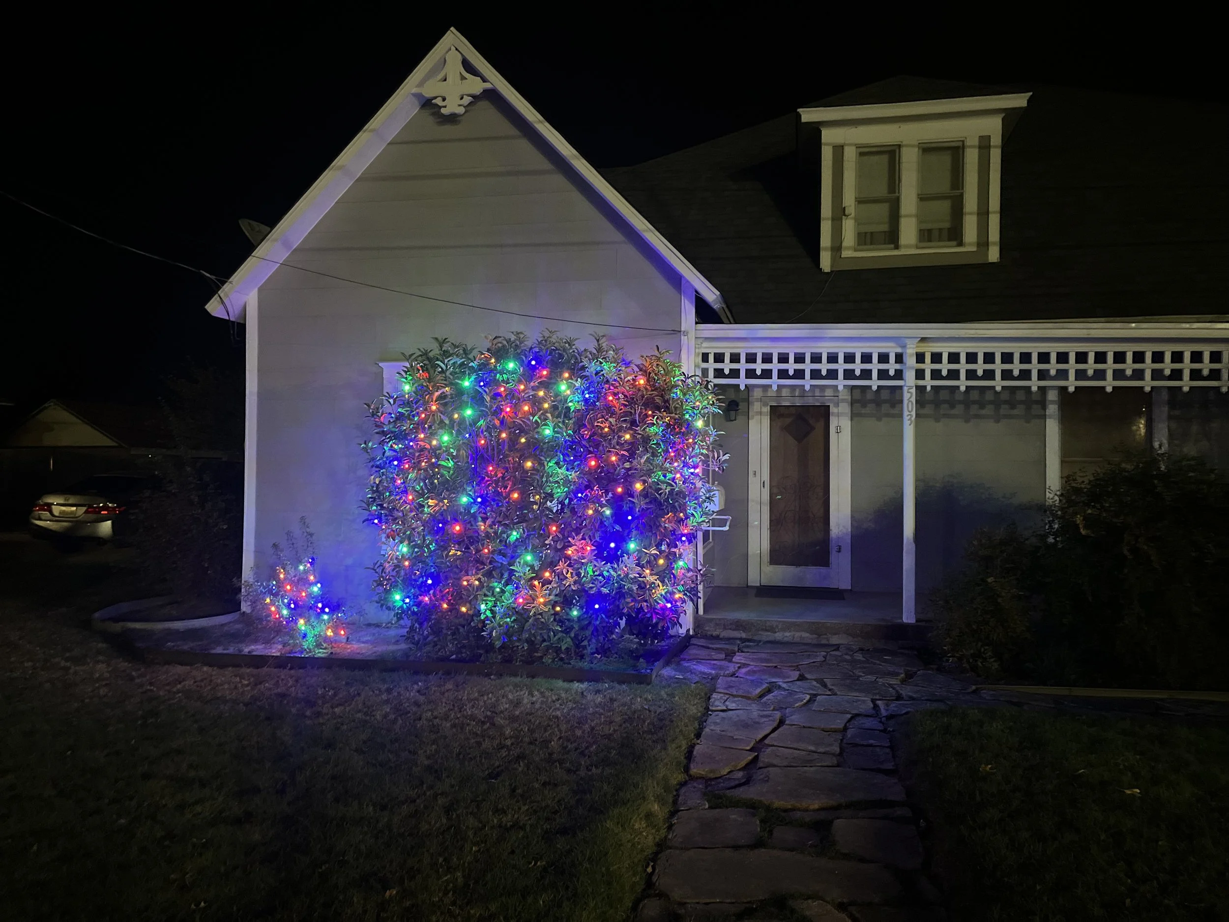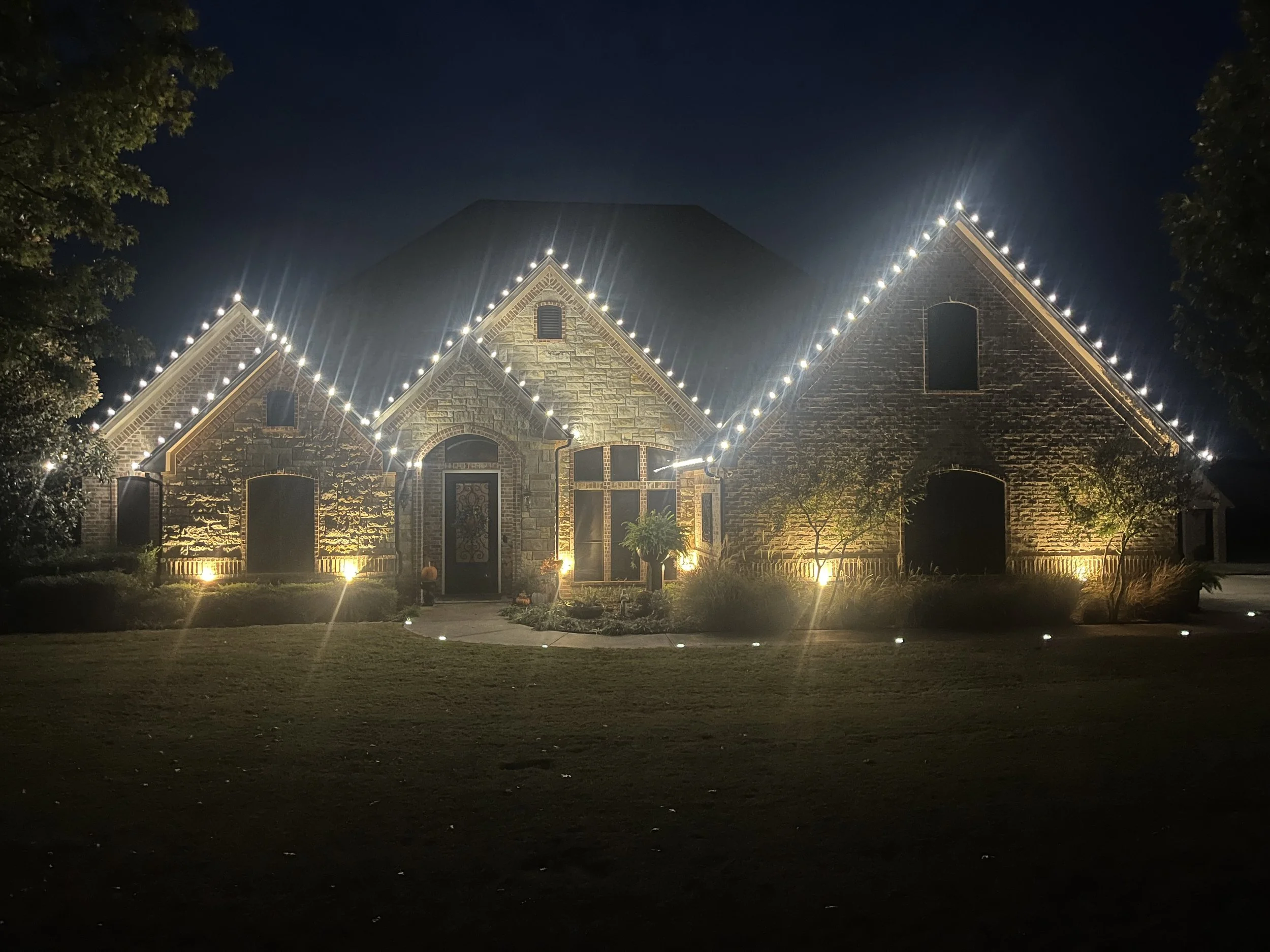 Our most popular option! Covers your full roofline and peaks, with the choice of warm white or multi-color designs. May include bushes, columns, or small trees wrapped for added curb appeal. Professional installation, removal, and storage included.